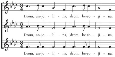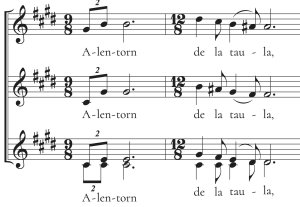 Ce chant traditionnel gascon nous conte l'histoire de trois faucheurs et de trois filles occupées à faner un pré. La plus jeune des trois va chercher le dîner, revient rapidement et appelle les faucheurs pour manger. Mais le plus jeune d'entre eux ne veut pas y aller, empêché d'avaler quoi que ce soit par l'amour qu'il éprouve pour elle.
